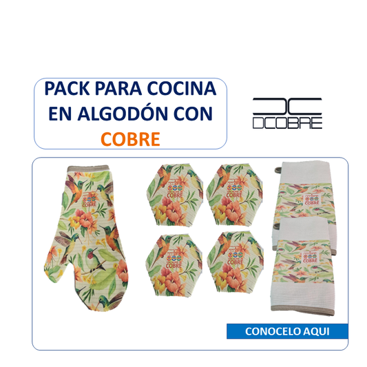 Pack para cocina en Polycotton con Cobre. Diseño Colibrí, NUEVO