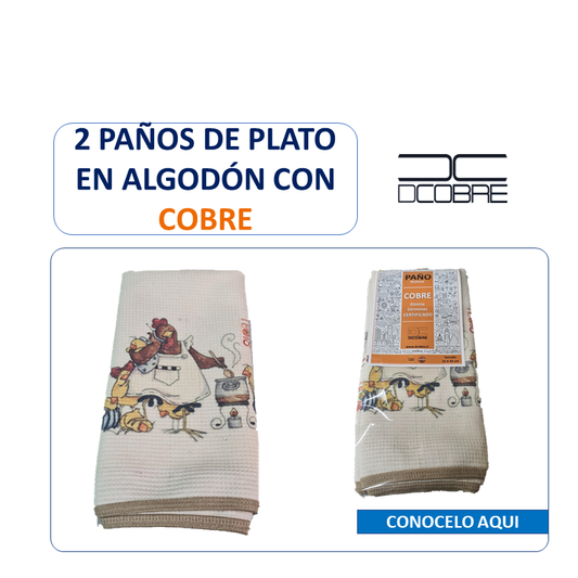Pack 2 Paños platos Polycotton Cobre elimina germenes y olores ,Diseño Gallina o Picaflor.