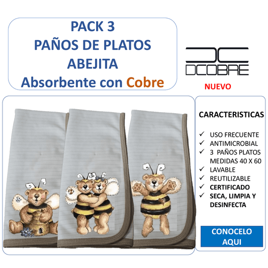 Pack 3 paños de platos absorbente ABEJAS , tela cobre activo (grueso).