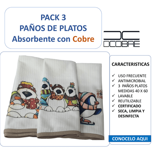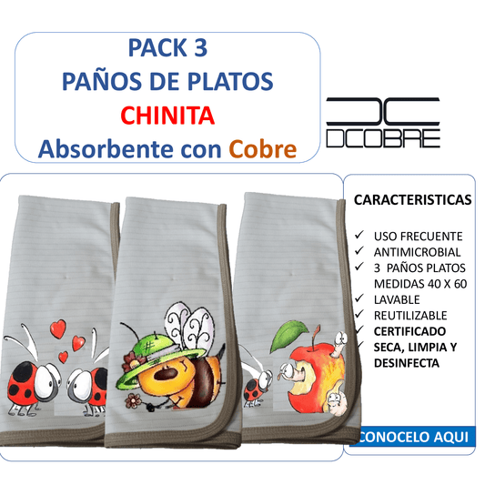 Pack 3 paños de platos absorbente CHINITAS , tela cobre activo (grueso).