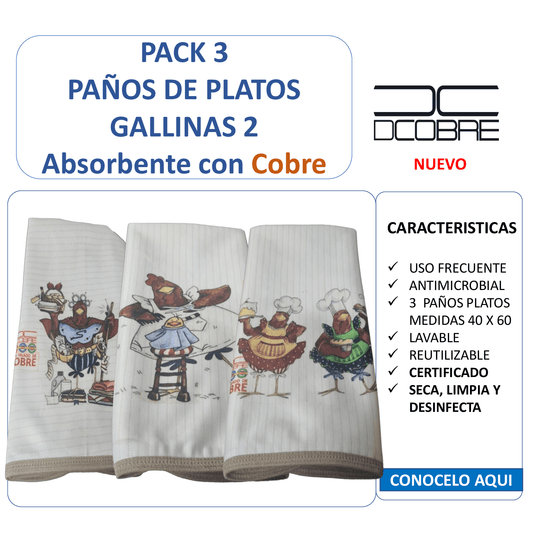 Pack 3 paños de platos absorbente, GALLINAS 2 tela cobre activo (grueso).
