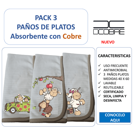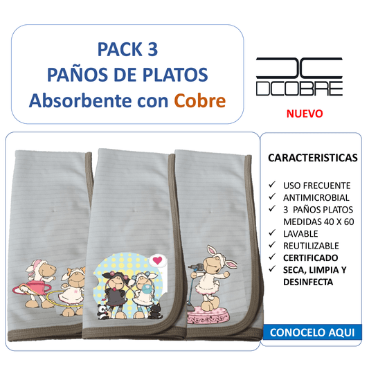 Pack 3 paños de platos absorbente OVEJITA DANCE , tela cobre activo (grueso).