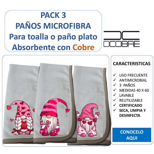 PACK 3 paños de platos absorbente DUENDES AMOR , tela cobre activo (grueso).