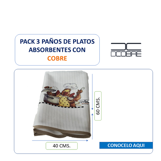 Pack 3 Paños de platos Cobre elimina gérmenes y olores Mod. Gallinas , absorbente (grueso).