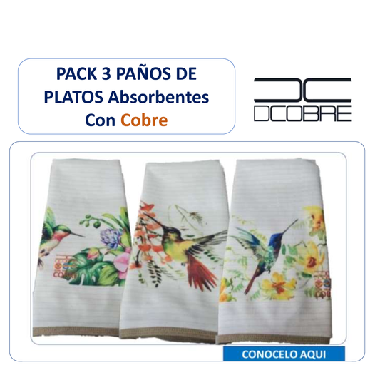 Pack 3 paños de platos Cobre absorbentes Mod. colibrí , tela cobre activo (grueso).