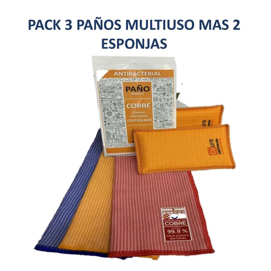 Pack 3 paños microfibra mas 2 esponjas CON COBRE. elimina germenes